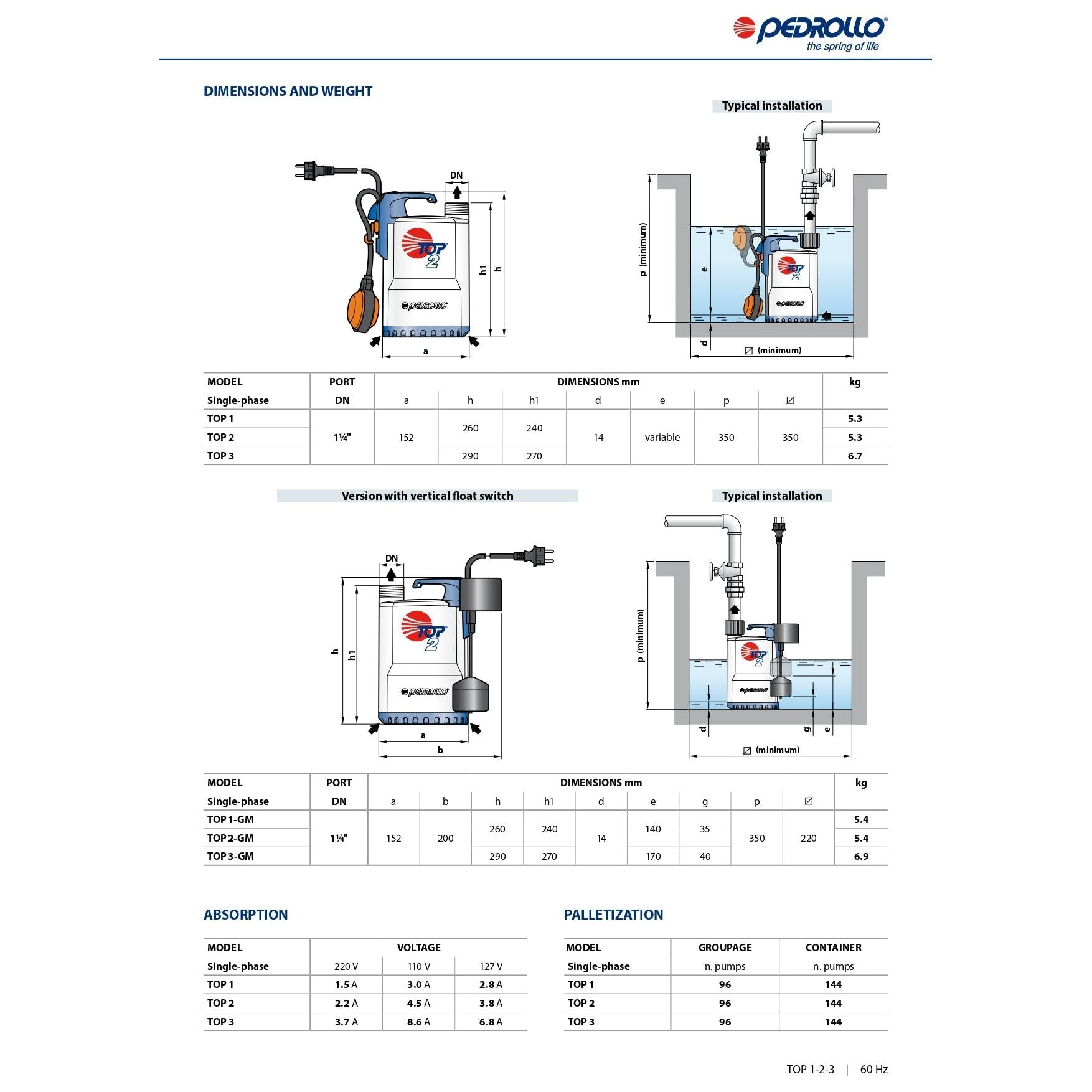The TOP Series pumps are designed for clear water without abrasive particles. With design solutions such as complete motor cooling and a double-sealed shaft, these pumps are both reliable and easy to use. Suitable for applications like draining small flooded areas (rooms, cellars, garages) in emergencies, disposal of domestic wastewater (dishwashers, washing machines), and emptying drainage traps.