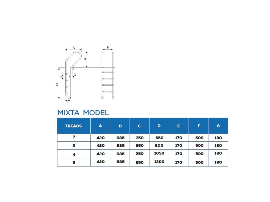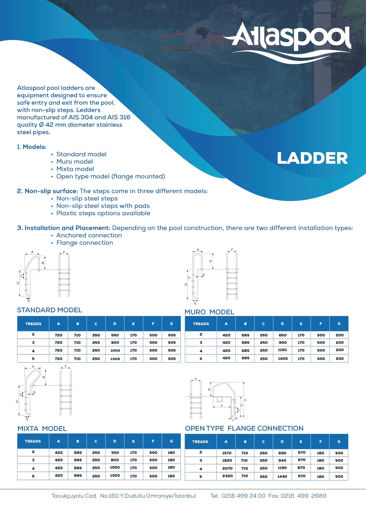 The Atlaspool Mixta Ladder is designed to ensure safe and comfortable pool access with a robust yet elegant design. Made of AISI 304 and AISI 316 stainless steel with a Ø 42 mm diameter, it provides exceptional corrosion resistance and long-lasting performance in aquatic environments.