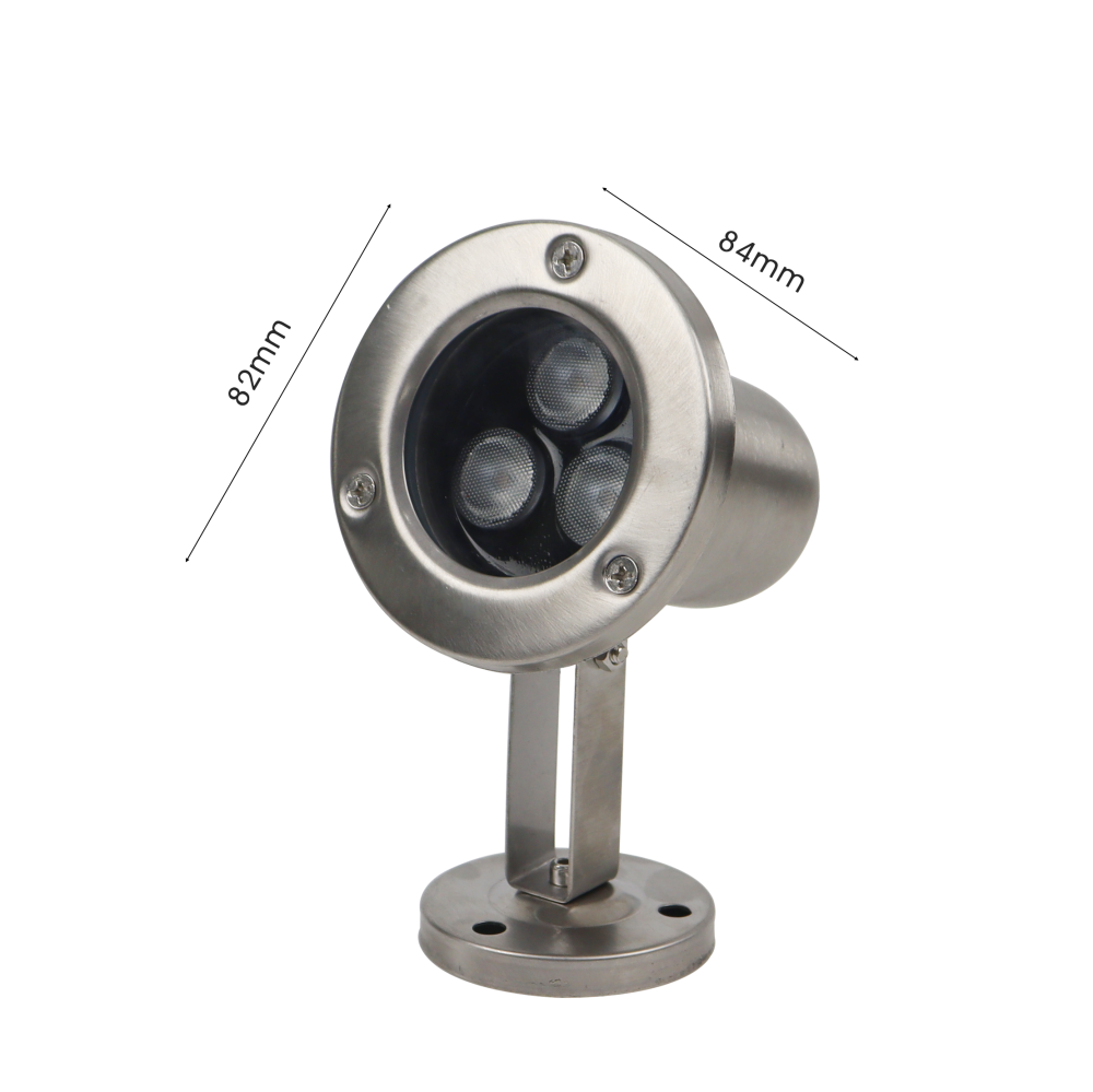 A compact 3W RGB LED light made of Stainless Steel 304 for durability and waterproof resistance. Ideal for small fountains and decorative pools.