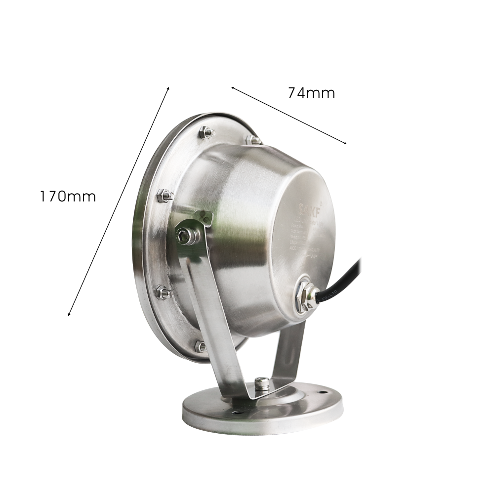 Small-sized RGB LED light with Stainless Steel 304 body, perfect for underwater or outdoor use such as pools, fountains, and pathways.