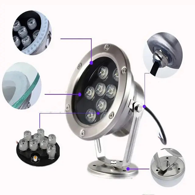 Premium 9W LED light made of Stainless Steel 304, available in RGB multicolor (with remote) and warm white versions. Designed for underwater lighting in pools and fountains.